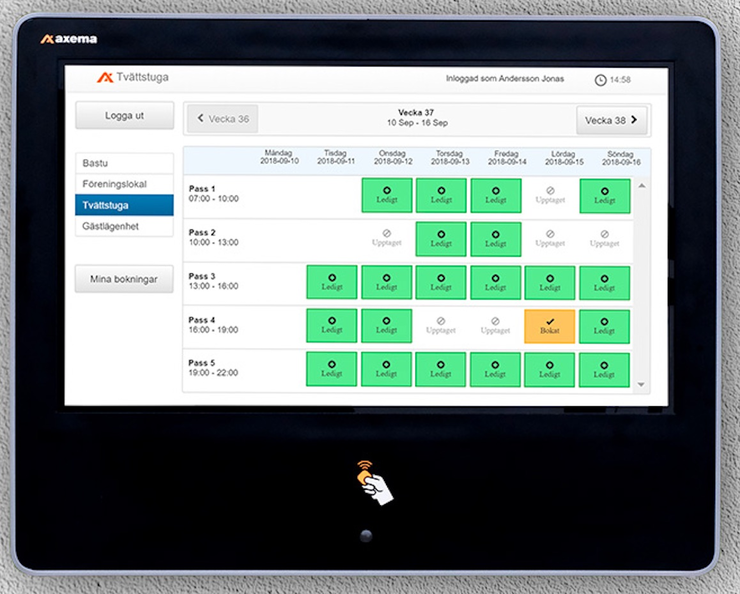 Aktivera bokningstavlan med din porttagg (märkt Bravida), Välj Bastu och och tidspass, välj med fingret vilken tid du vill boka (grön ruta är ledig).