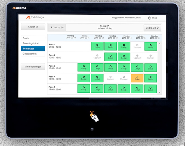 Du aktiverar tavlan med din tagg och bokar din tvättid genom att trycka med fingret på en ledig tid (grön ruta) som då blir gul (din bokning). Tomma rutor är redan bokade. Du kan boka max 4 tvättider under en vecka och max 2 bokningar per gång. Tvättiden är 4 timmar per bokning.