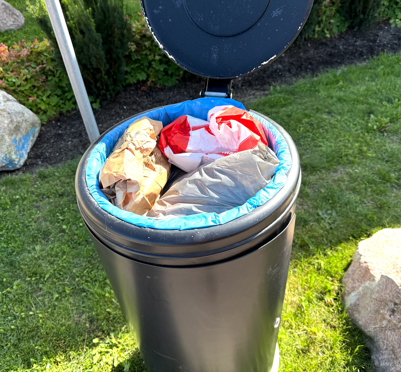 Vi betalar stora pengar till Bredablick som tar hand om hushållssopor i dessa papperskorgar vid infarterna, kostnader som hamnar på allas månadsfaktura. Hjälp oss alla att spara pengar genom att lämna dina hushållssopor i rätt behållare i Miljöbodarna - inte i papperskorgarna. De få extrastegen till Miljöboden spar onödig arbetstid och pengar. Ser du någon som slänger hushållsavfall i papperskorgarna. våga säg till. Tack.