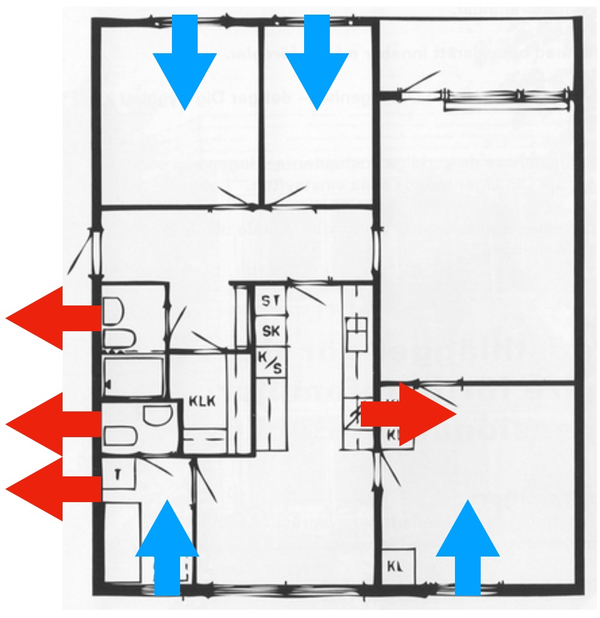 Bilden till höger visar luftens gång i en lägenhet. Frisk syrerik luft kommer in via fönsterventilerna (de blå pilarna). Sommartid via öppna fönster och altaner/balkonger. Och gammal luft åker ut via köksfläkten samt ventilerna i toalett och badrum (de röda pilarna). För att få ett bra flöde bör ventilerna vara öppna och dörrarna till våtutrymmena inte vara täta eller stängda. Fler av oss har fått en anmärkning om det på statuskontrollen, för även om ventilerna är öppna så hindras ventliationen om dörrarna är stängda och inte släpper in luft i tillräcklig mängd, vilket resulterar i mer fukt i våturymmena och lägre syrenivå i lägenheten.
